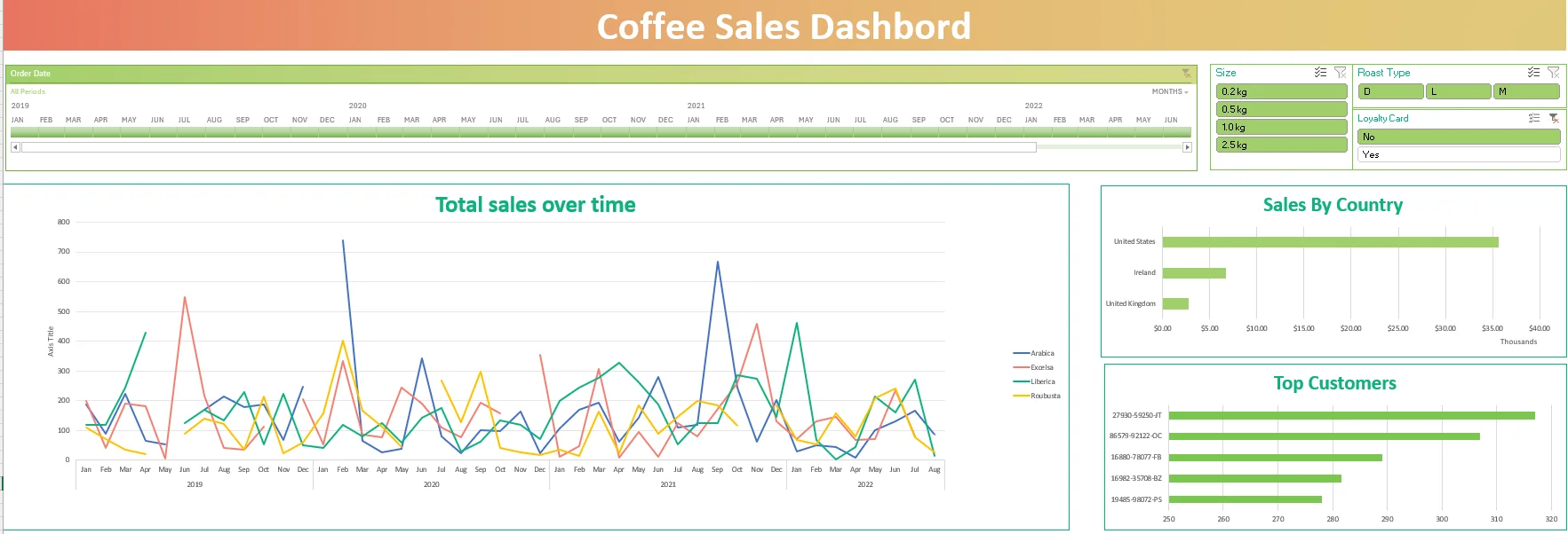 overview of coffee sales data, including total sales over time for different coffee types, sales by country, and top customers in interactive way.